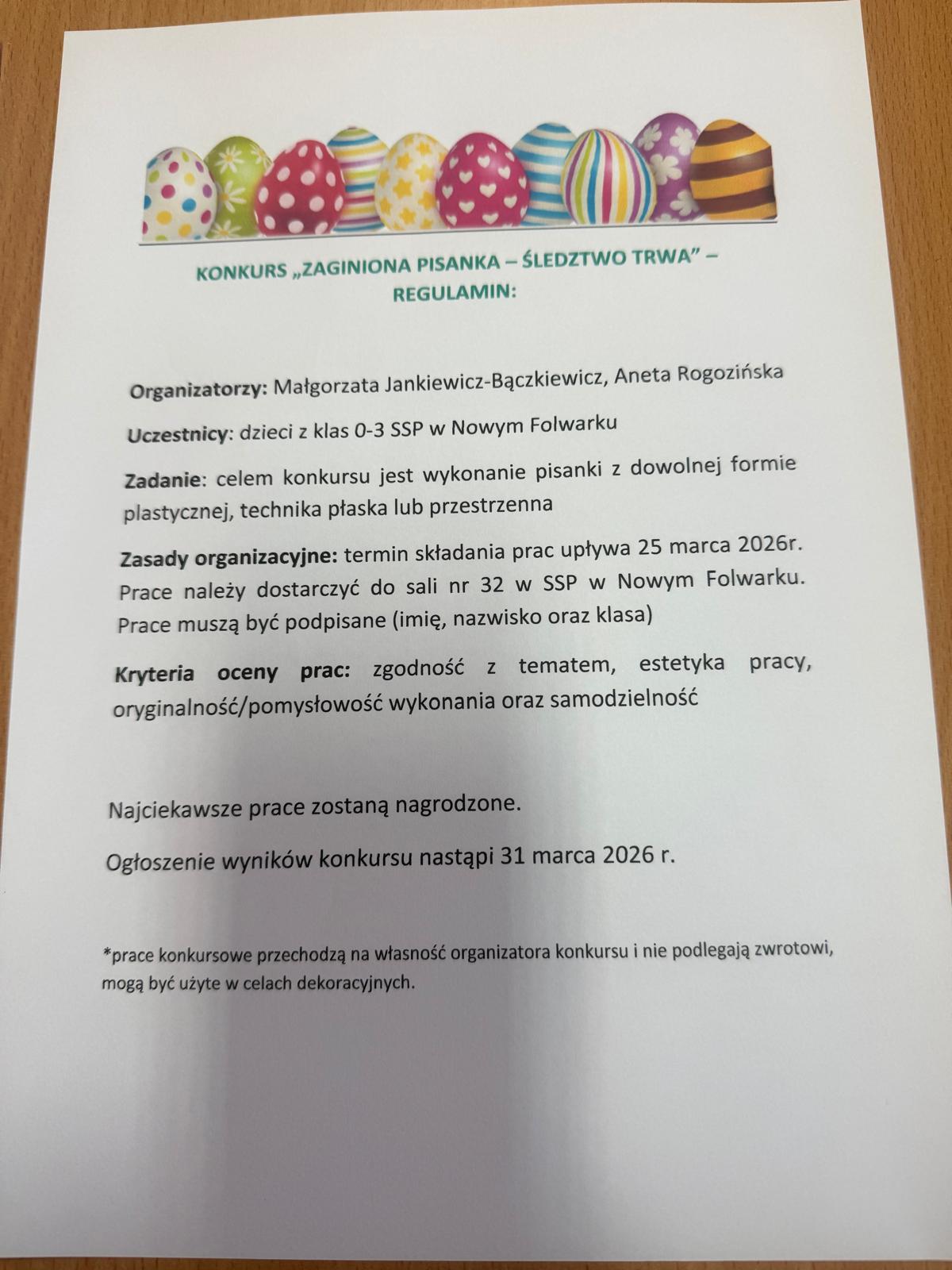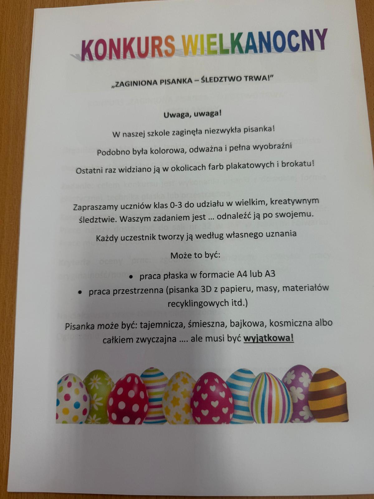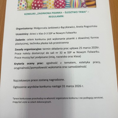 Uwaga, uwaga! W naszej szkole zaginęła pisanka! Zapraszamy uczniów klas 0-3 do udziału w kreatywnym konkursie. Pisanka może być: tajemnicza, bajkowa, kosmiczna. Termin składania prac konkursowych do 25.03.2026. Prace należy dostarczyć do sali 32.